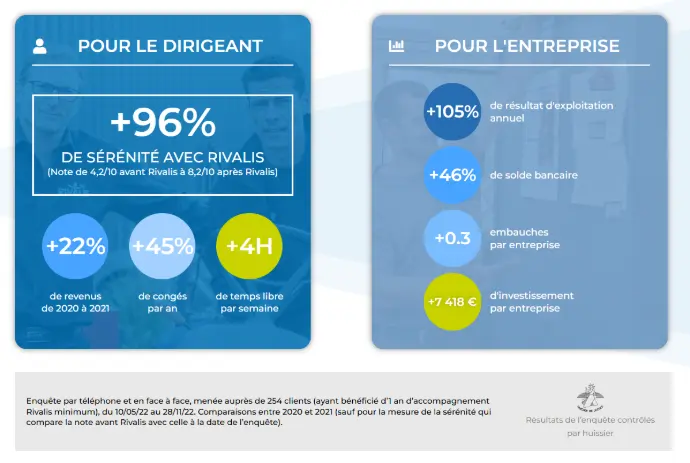 Rivalis a mesuré en 2022 les résultats de sa méthode auprès des dirigeants de TPE/PME. La méthode Rivalis, c'est l'alliance d'un outil de pilotage quotidien et de l'accompagnement d'un conseiller tous les mois pour aider le dirigeant à prendre les meilleures décisions. Une fois de plus, elle confirme sa pertinence et ses bienfaits, tant pour l'entreprise que pour le dirigeant.